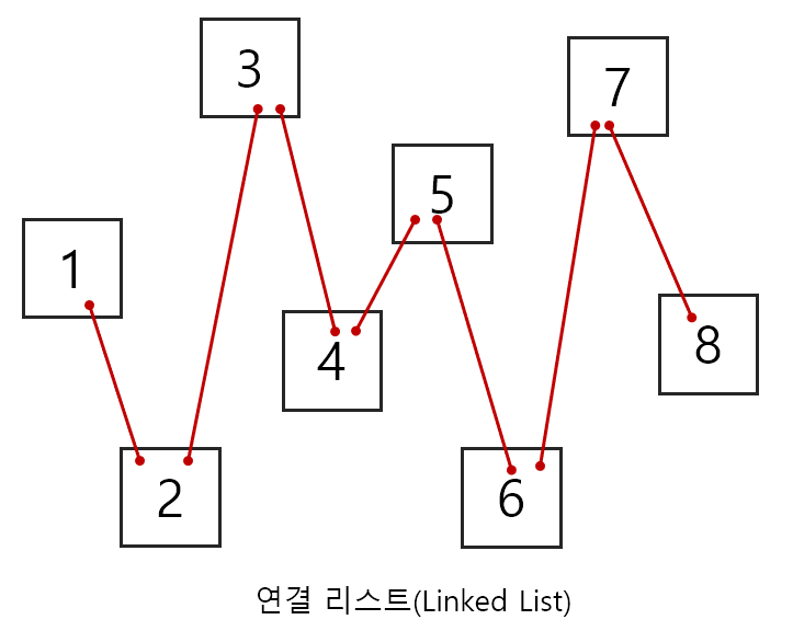 ex) 만약 5번째 원소에 접근하고 싶다면, 그 자료의 위치는 4번째 원소와 6번째 원소만이 가지고 있다. 그래서 4번째 자료에 접근하려고 보니 또 4번째 원소의 위치는 3번째 원소만이 가지고 있다. 이렇게 5번째 원소에 접근하기 위해서 1번째 원소부터 타고타고 들어가야 하므로 임의접근이 불가능하여 N번째 원소를 바로 찾을 수 없다는 단점이 있다. - 이러한 구조는 배열의 단점이었던 원소의 중간 삽입/삭제에 있어서 탁월한 성능을 보인다.❗ 말그대로 삽입, 삭제의 연산이 빠른거지, n번째 자리를 찾아서 그 자리에 있는 원소를 삭제하거나 아니면 그자리에 원소를 삽입하는 것은 n번째 자리를 찾는 다는 연산이 포함되어 있으므로 비효율적일 수 있다.