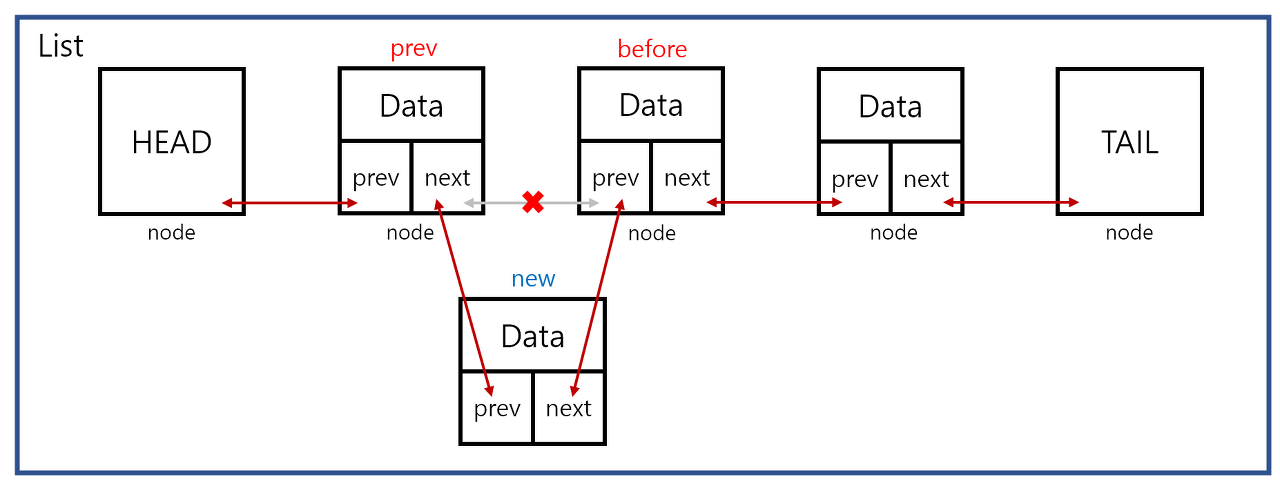 위와 같이, prevNode의 _next와 newNode의 _prev를 이어주고 before의 _prev와 newNode의 _next를 이어주면 자연스레 prevNode와 before의 연결은 끊어지고 그사이에 newNode가 삽입되게 된다. 이 과정이 단 코드 4줄에 의해 실행되므로 시간복잡도는 O(1)을 가진다고 할 수 있다.