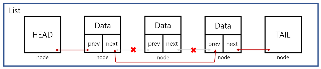 먼저 List는 기본적으로 안에 아무런 자료가 들어가지 않아도 디폴트로 head노드와 tail노드를 가지고 있다. 이 노드는 아무런 데이터도 들어있지않은 Dummy Node인데, 이러한 노드를 시작부터 배치해놓은 이유는 리스트를 생성하고이 리스트에 데이터를 삽입할 때, 이런 노드가 없다면 리스트에 아무것도 없을 때와 있을 때를 구분해서 구현해야한다. 따라서 편의를 위해서 리스트의 시작과 끝을 나타내는 노드들을 dummy로 배치해 놓는 것이다.