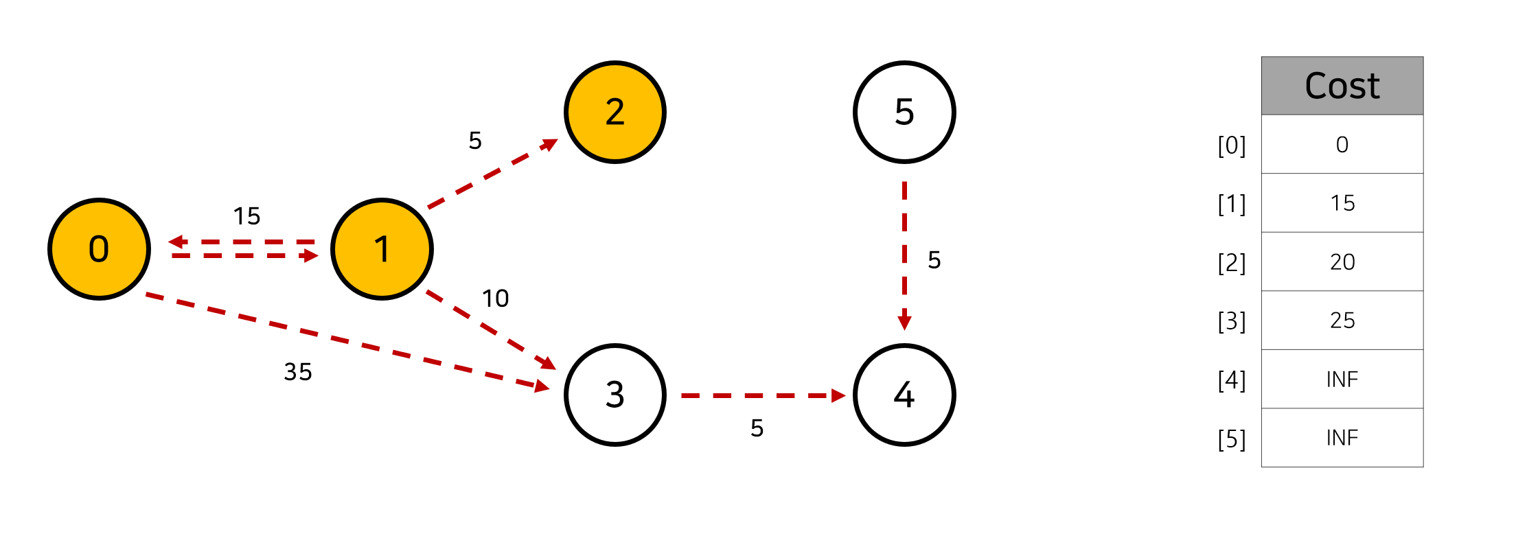 (0์์ 3๋ฒ์ผ๋ก๊ฐ๋ ์ต๋จ๊ฑฐ๋ฆฌ) + (3์์ 4๋ก ๊ฐ๋ ๊ฑฐ๋ฆฌ) = 30 < best[4] = INF ์ด๋ฏ๋ก best[4]๋ 30์ผ๋ก ๊ฐฑ์ ๋๋ค.