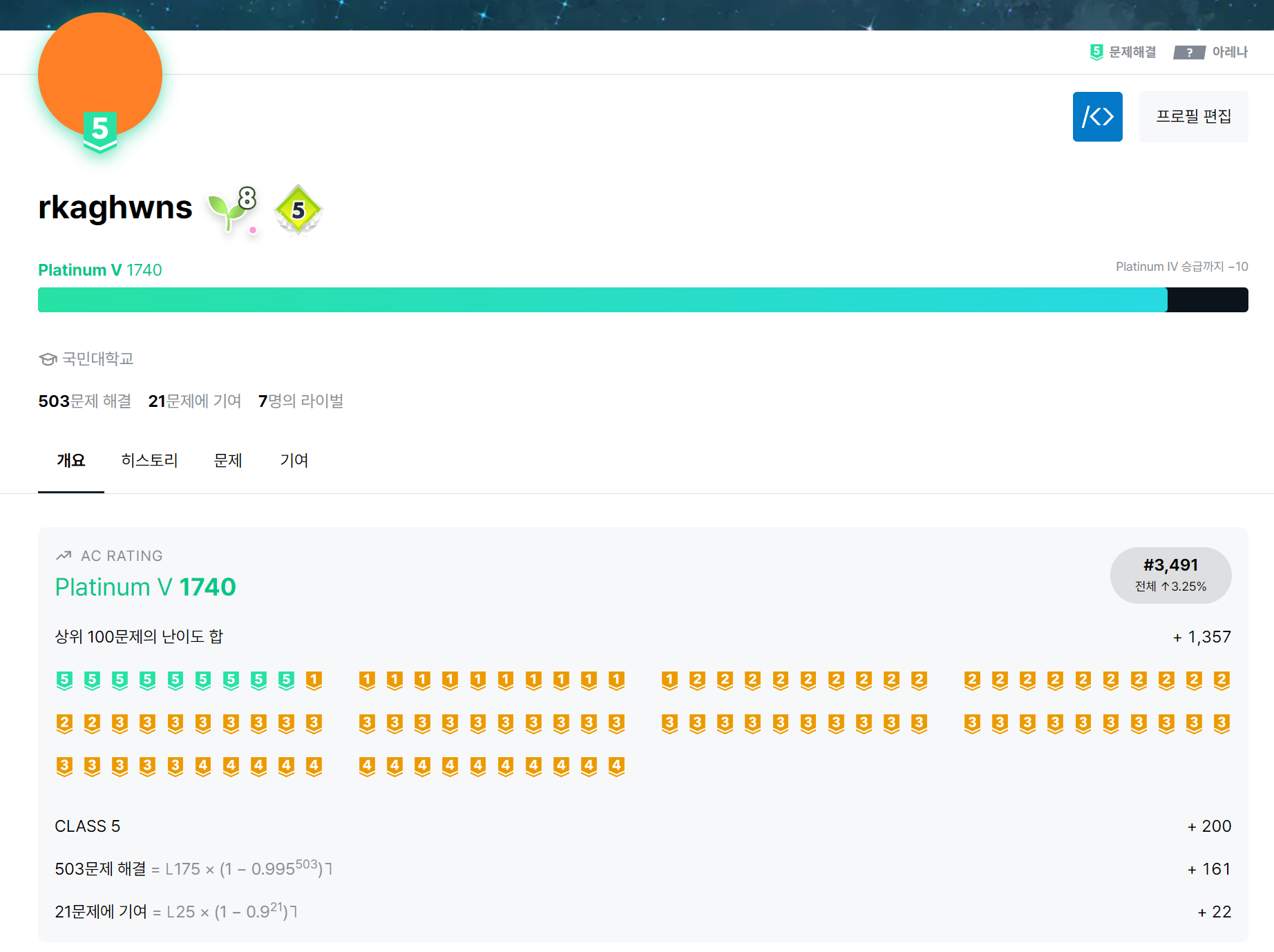 플레티넘을 달성한지는 반년이 넘었고, 그 뒤로는 알고리즘 푸는 것에 좀 소홀해지기도하고, 점수가 올라가려면 고난도의 문제를 풀어야해서, 대회가 아닌 코딩테스트가 목적인 나로써는 지금은 티어에 별로 연연하지 않고 있다.