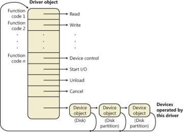 드라이버 오브젝트에는 여러개의 디바이스 객체가 연관되어 있는 경우가 많다. 드라이버의 객체목록에는 드라이버가 제어하는 물리적, 논리적 디바이스를 나타낸다. 예를들어, 하드 디스크의 각 파티션에는 파티션별 정보가 포하된 별도의 디바이스 오브젝트가 있다. 그러나 모든 파티션을 핵세스하는 데에는 동일한 하드 디스크 드라이버가 사용되기 때문이다.